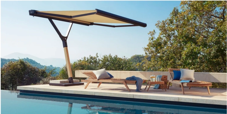 Les parasols plantés autour de votre bassin viennent en complément de votre pergola ou de vos stores. Ils permettent de prolonger la zone ombragée ou de créer une barrière au soleil sur les côtés de vos aménagements. Veillez à ce qu’ils soient lestés et robustes pour ne pas tomber, s’envoler ou se casser au premier coup de vent.