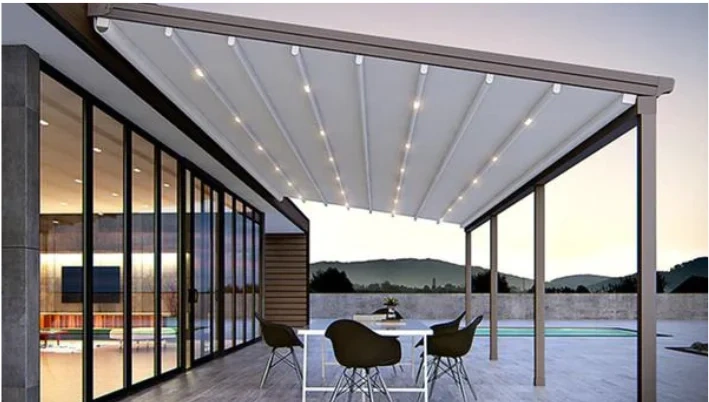 Le toit de la pergola classique est couvert par un tissu de protection solaire. Celui-ci est rétractable grâce à un système s’appuyant sur des roulements, afin que vous moduliez l’exposition au soleil en fonction des heures de la journée. Pour vous faciliter la tâche, le toit rétractable peut être automatisé. Le moteur est alors pilotable à distance. La toile est aussi prévue pour résister à la pluie qui glisse dessus, comme sur les plumes d’un canard.